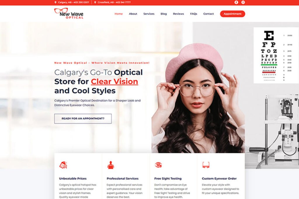 New Wave Optical, serving Calgary AB & Crossfield AB, is a leading provider of optical services and eyewear. We’ve crafted their logo and developed a sleek, user-friendly website, enhancing their online presence and helping them reach a broader customer base.