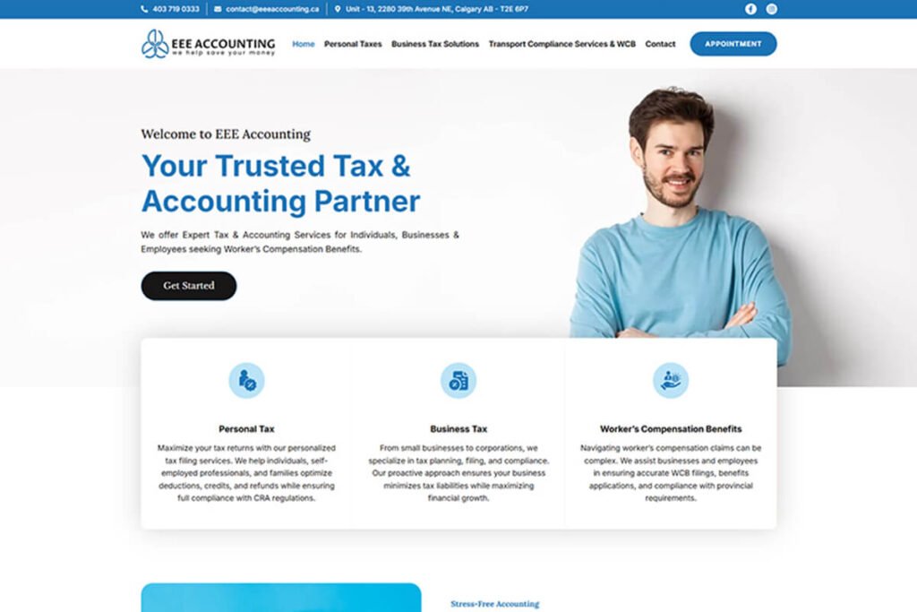 EEE Accounting, a professional accounting firm in Calgary AB, is known for its reliable services and client-focused approach. We enhanced their brand with a clean, trustworthy logo and a streamlined website that clearly presents their services, making it easy for clients to connect and engage.