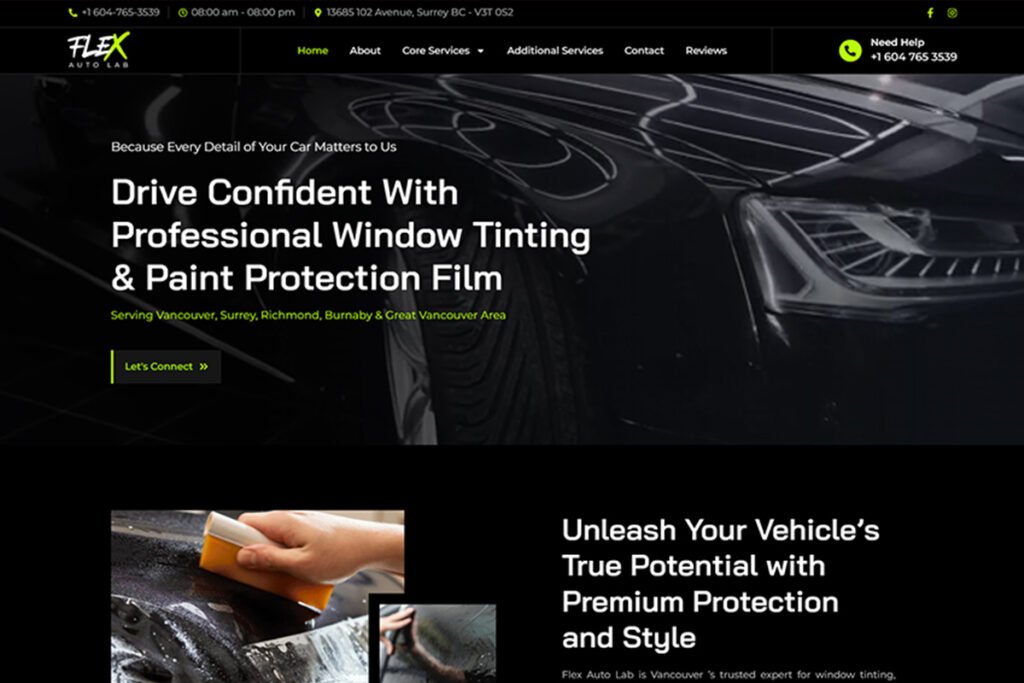 Flex Auto Lab based in Surrey BC, offers expert services in Paint Protection Film, Window Tinting, and more. We transformed their brand with a bold new logo, a sleek website, and ongoing social media management—building a clean, high-end identity that reflects their commitment to quality automotive care.