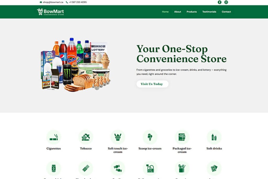 BowMart Convenience Store, a modern Canadian convenience store, needed a stronger brand presence. We designed a fresh logo and a clean, user-friendly website that clearly showcases their products, helping them present a trustworthy and convenient shopping experience.